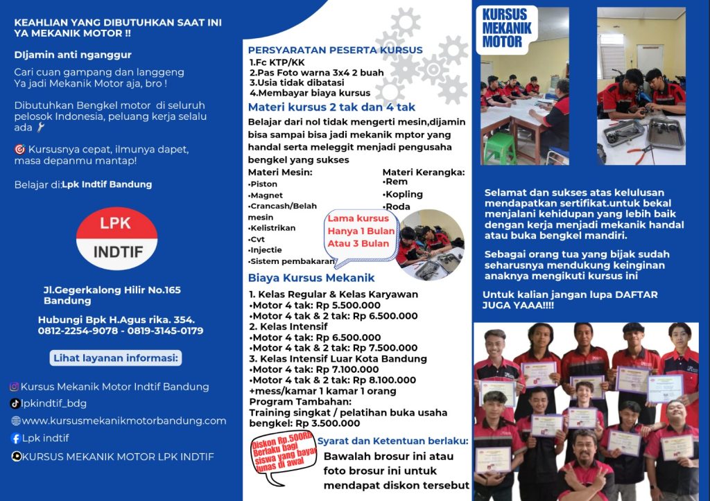 Keahlian jadi Mekanik motor itu salah satu keahlian yg sangat dibutuhkan ! disaat lowongan kerja sangat terbatas. Raih ilmu mekanik